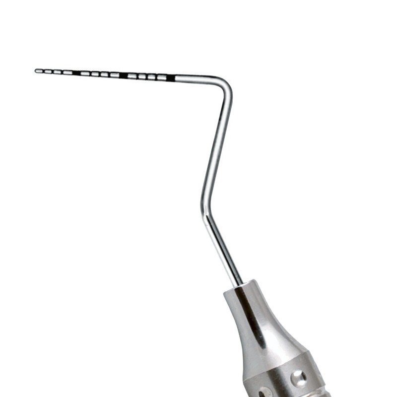 Expro is a double-ended instrument with an explorer on one end and a screening probe (color-coded) on the other. Screening probes are color-coated with accurate, smoothly finished black markings which will not chip, flake or fade. Probes are used to assess pocket depths, periodontal attachment levels, and gingival bleeding. Explorers are used to detect caries and calculus.